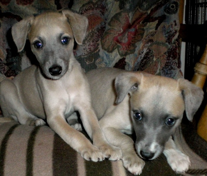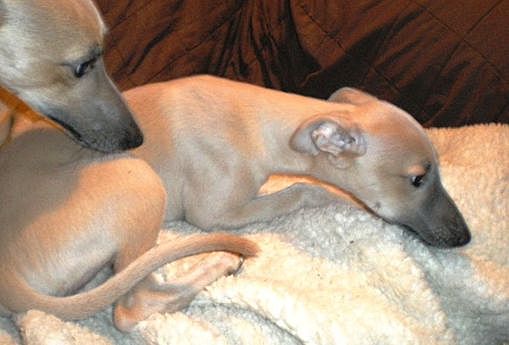 The Whippet puppies have their front dew claws removed, because whippets are prone to catching & tearing them if not. this is permissable in this breed. Both breeds are born without hind dew claws.